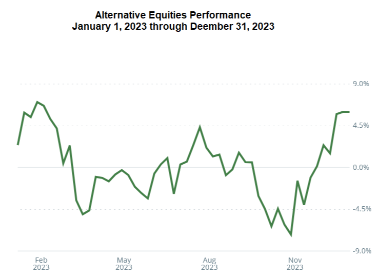 The Alternative Equity Portfolio of positions in REITs, energy, agriculture, and venture capital opportunities produced a total return of just under six percent for the year. The category was negative for much of the year as a direct result of a combination of the Fed’s raising of interest rates and inflationary impacts. The one shining star remained the REIT Portfolio of cyber-security facilities which experienced impressive increases in demand despite the general economic slump. Iron Mountain returned over forty-seven percent for the year. And the entire REIT portfolio continued to produce meaningful dividends from the steady rents being received throughout the year. We expect this entire category will benefit from the underlying value increases of the properties from lower interest rates. Historically, real estate investments have resulted in long-term total returns rivaling the returns from the Domestic Equity Portfolio. On December 31st, the Alternative Equity Portfolio represented just over twenty-five percent of the total portfolio.