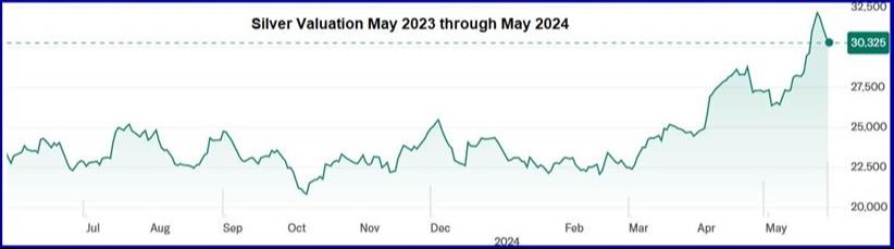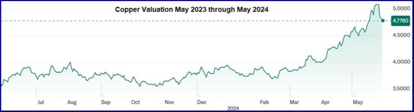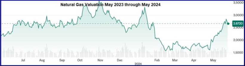 To meet the anticipated need for more (and clean) electrical power, James and I have been busy digging deep into the raw materials that will be needed to fuel the growth. Our efforts have so far been focused on how Copper, Silver, Natural Gas and Lithium are integral elements of the electrical energy generation equation. We have been addressing opportunities where our portfolio can gain exposure through companies involved in mining, refinement, and related activities. To illustrate our thinking, Laura has included the three graphs below depicting the one-year history of Copper, Silver and Natural Gas valuations as the increasing need for more electricity has expanded on the back of the AI revolution.