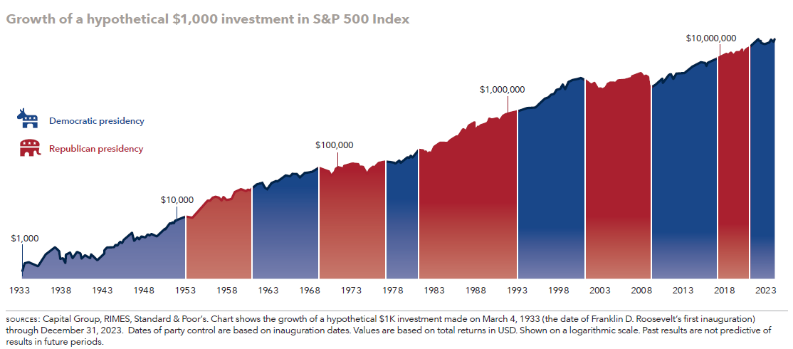Over the long haul it is the time in the market, not timing the market that matters. We will not put your money at risk by anticipating election results as you could miss future growth opportunity once the dust settles from an election. Instead, we will continue to invest based on the fundamentals that impact the markets over the long run. The chart below provided by Capital Group (one of the world’s largest investment management companies) demonstrates that presidential election results have not historically correlated to an advantage or disadvantage in the stock market.