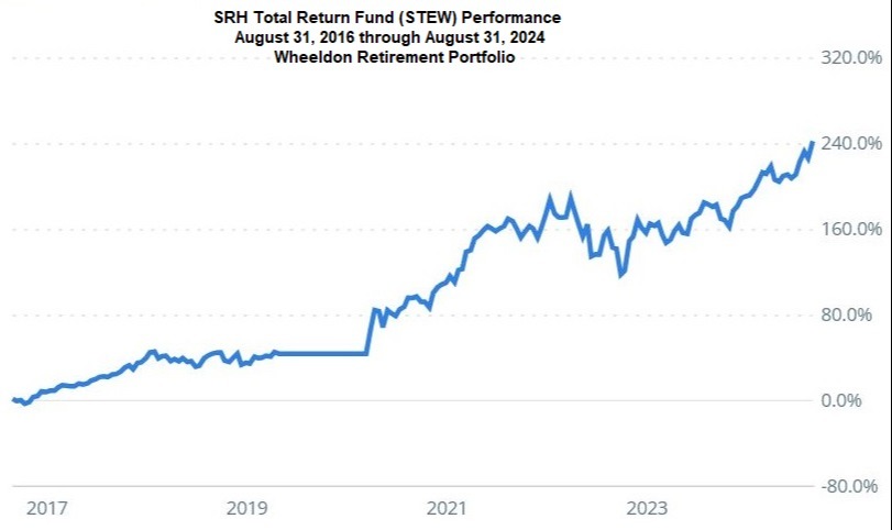 Our broadly diversified portfolio has included Buffett’s results for many years now. We proudly own Berkshire through the closed end investment company SRH Total Return Fund (STEW) which holds both Berkshire as well as many of the individual companies in the Berkshire portfolio. Using my and Jeannie’s retirement portfolio as a proxy, STEW returned 242 percent (before management fees) for the eight-year period ended August 31, 2024; including a year-to-date return of almost eight percent. Nearly all managed client portfolios include a meaningful allocation of STEW. Laura has included the STEW eight-year blue line graph for reference.